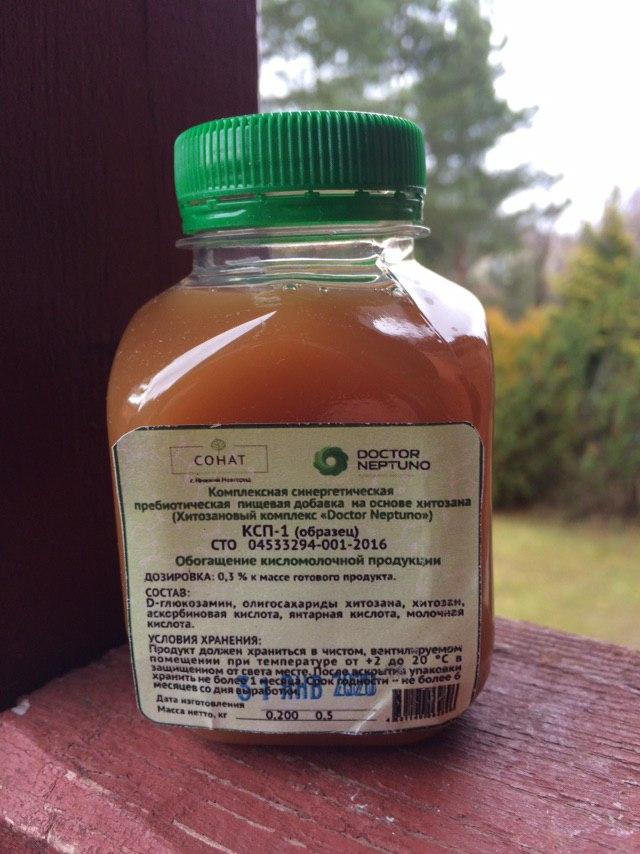 Специалистам ООО «Сонат» удалось создать стабильный 15 % раствор хитозана с различной молекулярной массой (от мономеров и олигомеров (олигосахаридов) хитозана до хитозана с молекулярной массой до 240 КДа) в трех пищевых кислотах – аскорбиновой, янтарной, молочной, который и был зарегистрирован как «Комплексная синергетическая пребиотическая пищевая добавка на основе хитозана» (КСП-1).