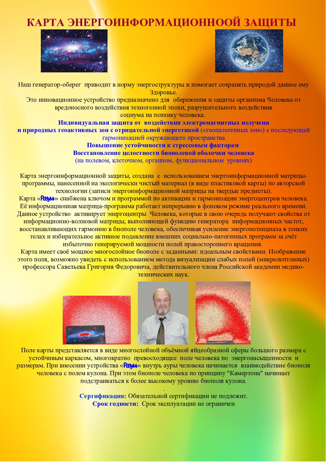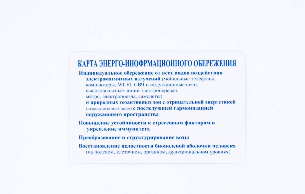 Карта активирует энергоцентры, которые в свою очередь получают свойства информационно-волнового устройства выполняющего функцию «ритмодатчика» информационных частот устраняющих десинхронизацию процессов в биополе человека, обеспечивая избирательное активное подавление внешних социально-патогенных излучений и стимулирует всю биоэнергетику организма за счёт избыточно генерируемых полей правого вращения.
