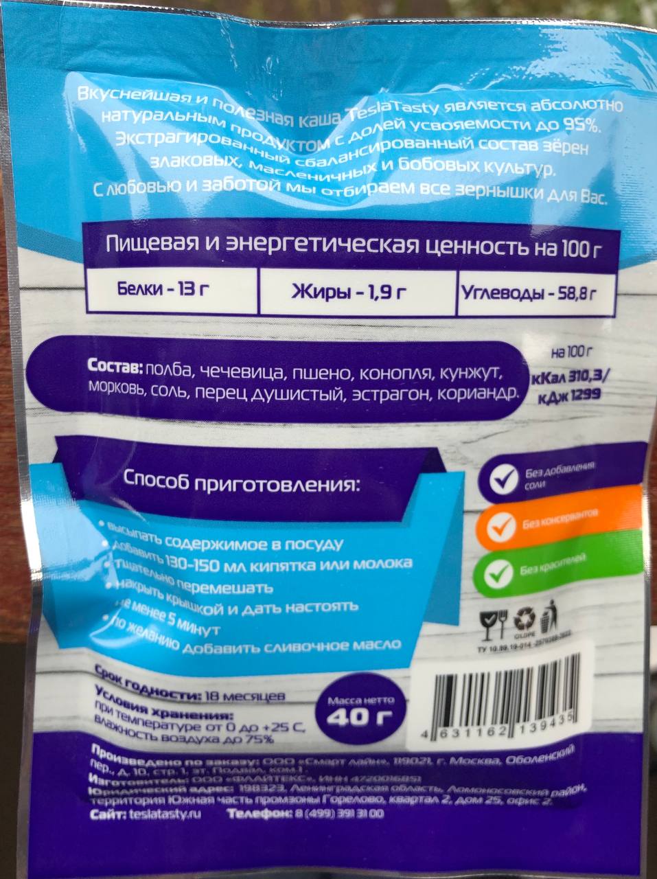 Каждый продукт TeslaTasty является абсолютно натуральным, с долей усвояемости до 98%, что способствует быстрому усвоению питательных веществ. Крупы в пакетиках изготовлены из отборного цельнозернового сырья, прошедшего экструзионную обработку (с сохранением цельной оболочки зерна), что позволяет повысить перевариваемость белков. Получаемый высушенный концентрат, обогащенный аминокислотами, углеводами и чистым белком, помогает укрепить устойчивость организма к стрессовым воздействиям. За счет идеального сочетания и соотношения компонентов мультизлаковая каша помогает гармонизировать биоритмы организма – восстановить синхронизацию с природными суточными ритмами.