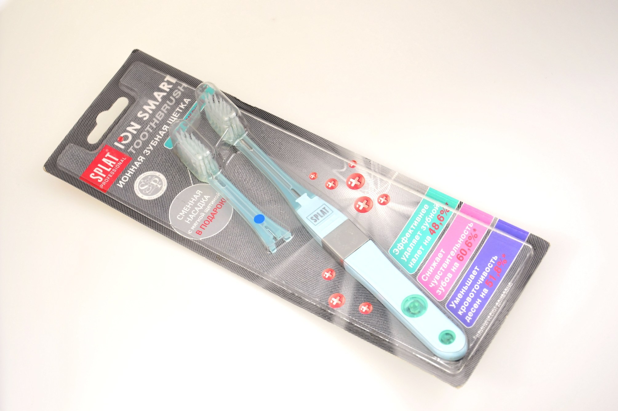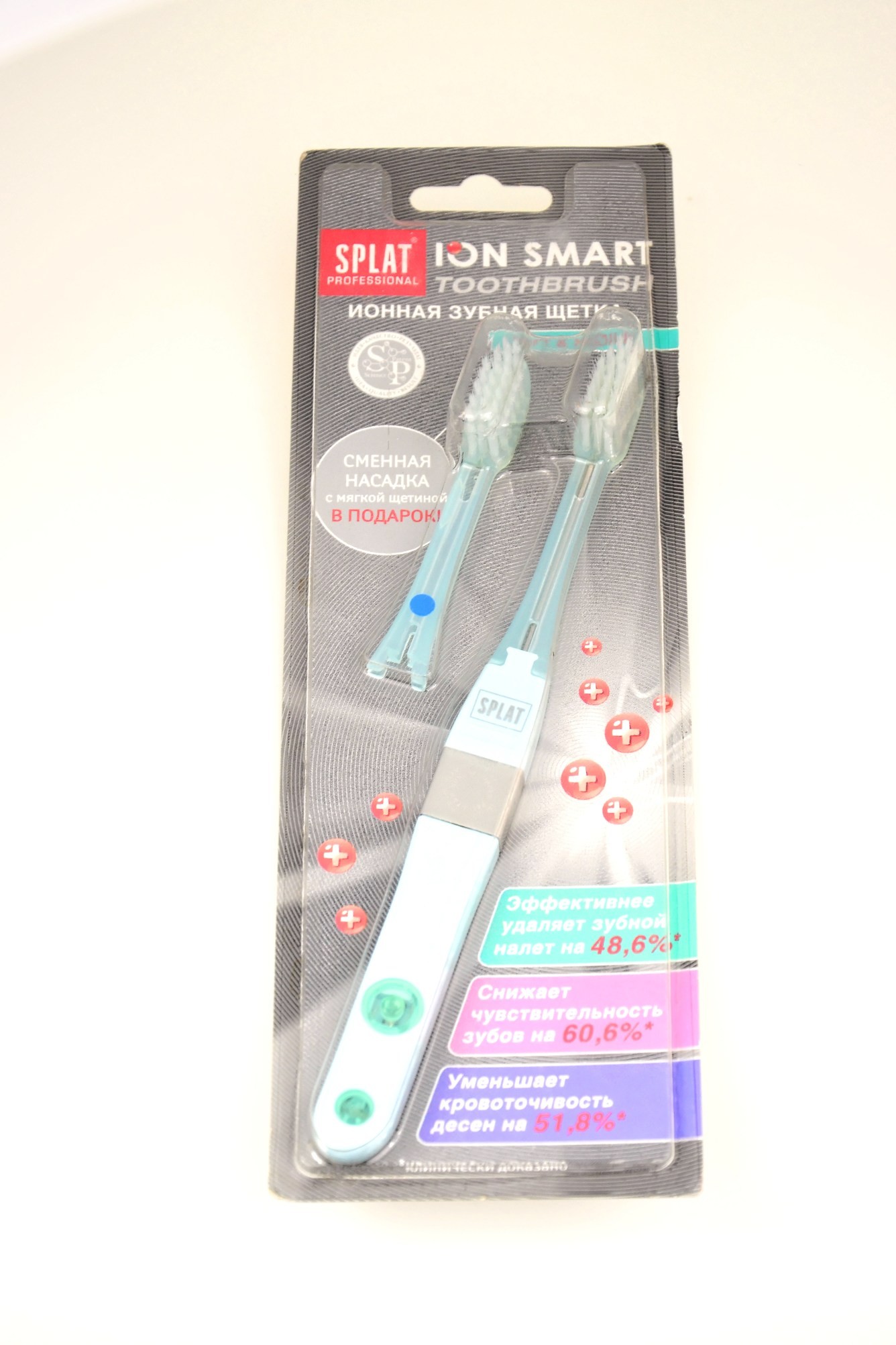 * При использовании ионной зубной щетки SPLAT полярность зубов меняется с отрицательной на положительную. Зубной налет отталкивается от одноименно заряженной поверхности зубов и притягивается к отрицательно заряженным ворсинкам зубной щетки.